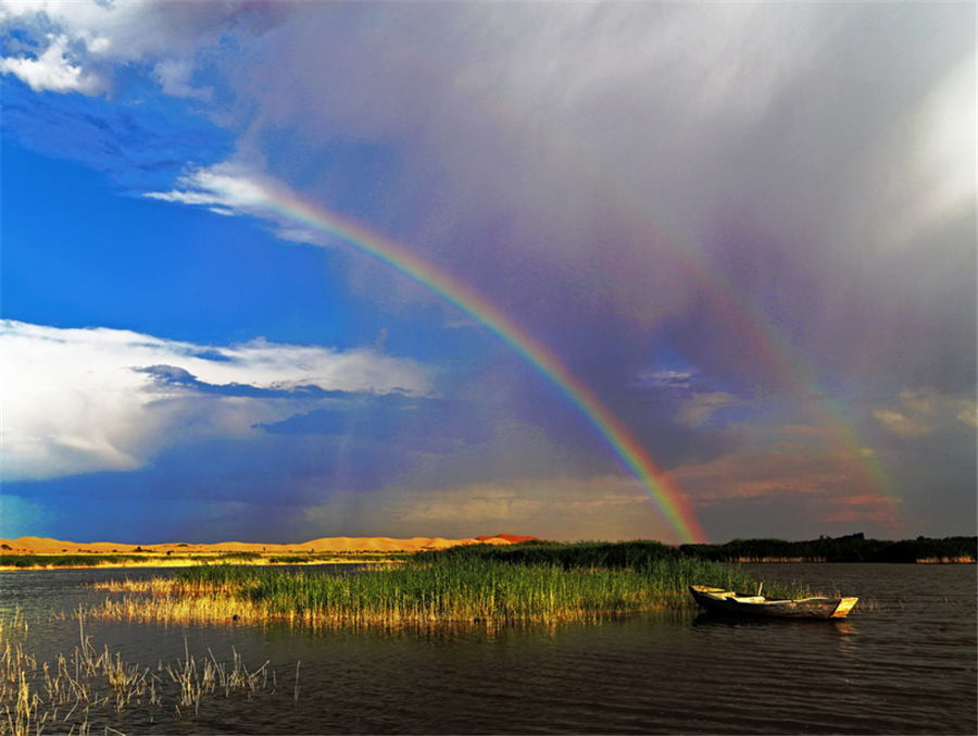 雨后美丽的库布齐沙漠腹地七星湖彩虹