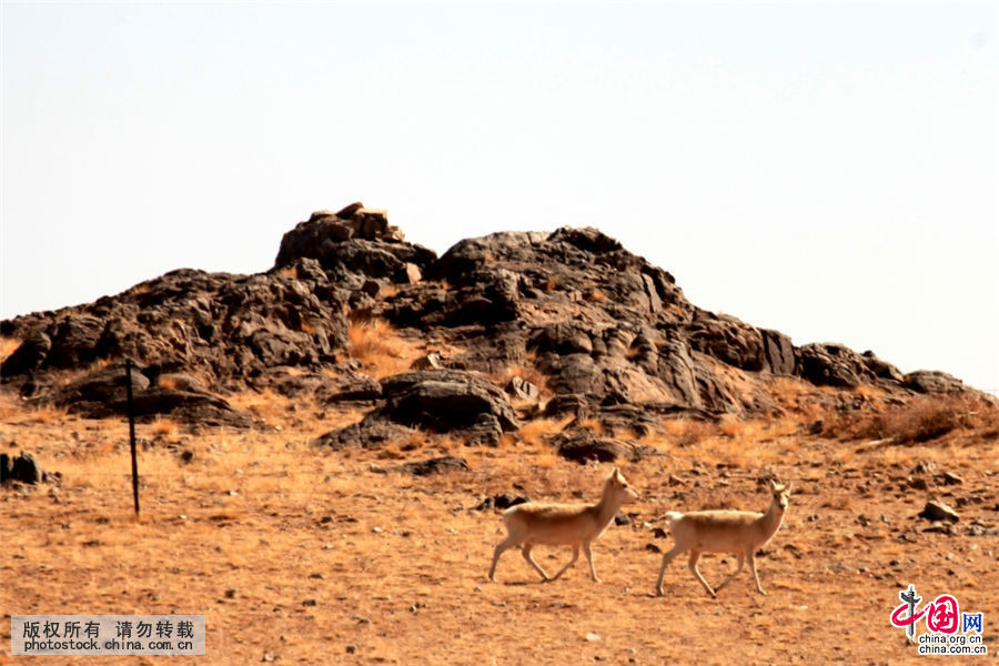 草原上栖息觅食的野生黄羊。黄羊全身黄褐色,臀斑白色。多栖息于山间平盆地和湖周半荒漠地带,以数头或数十头为群,冬季往往结成大群,属国家二级野生保护动物。中国网图片库 作者:郭鹏杰