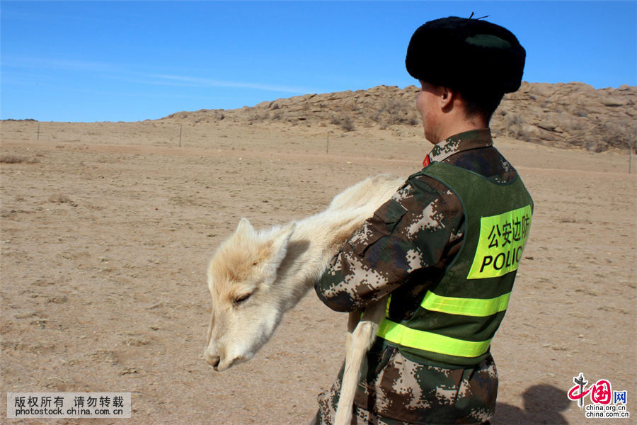 巡逻民警发现一只身体虚弱、倒在草原上的小黄羊。中国网图片库 作者:郭鹏杰