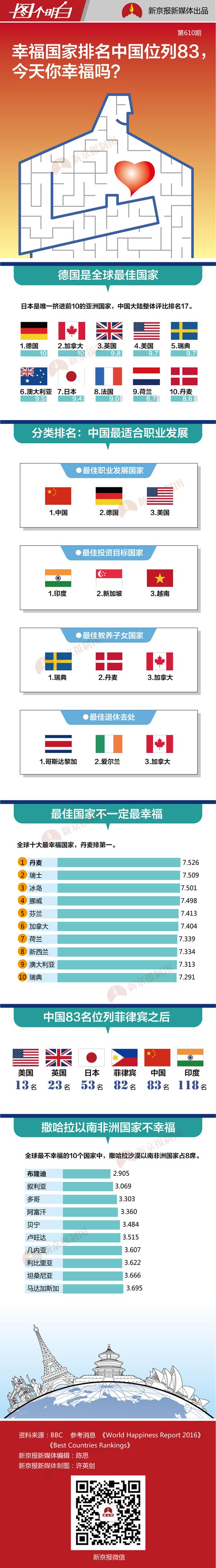 3月20日将迎来国际幸福日。联合国“可持续发展解决方案网络”(SDSN)与哥伦比亚大学地球研究所16日共同发布了《2016年全球幸福指数报告》,丹麦从去年的第3名跃升至首位,成为年度世界最幸福国家,中国在156个国家中排名83位。