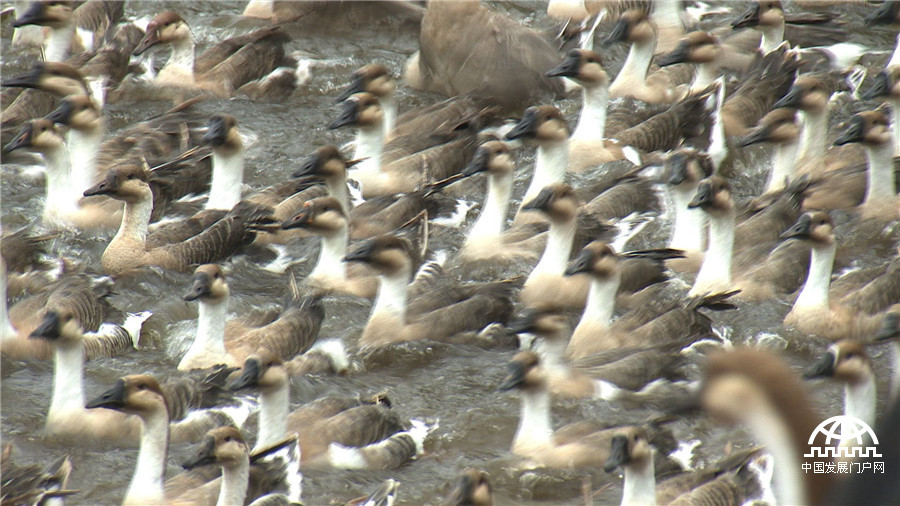 养殖的大雁尽管进行了驯化,但还带有很多野生大雁的习性,每当郑英维喂它们时,一群大雁全躲得远远的。