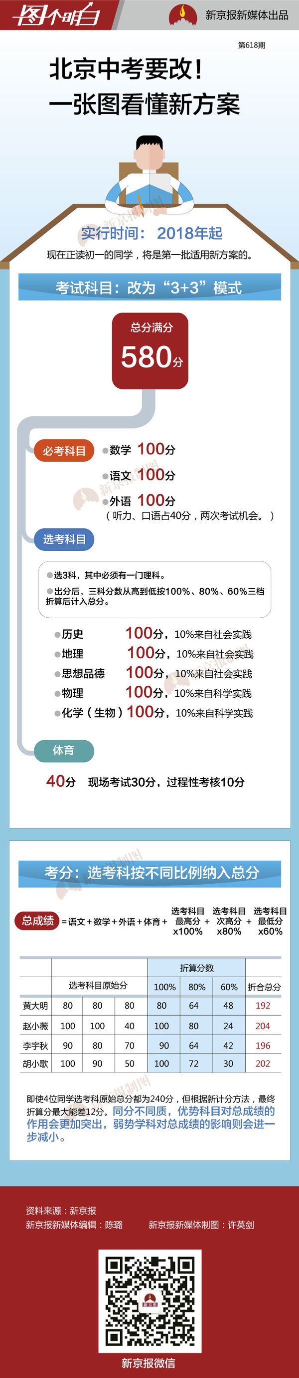 今天上午,北京市教委发布了中考改革方案。考试科目采取“3+3”模式,即数学、语文、外语三门必考,再加上历史、地理、思想品德、物理、化学(生物)。这意味着今后学生的考试方案最多可以有9种。此外,选考科目的也有特殊的计分分方,原始分一样的同学最终得分也会不同哦。一张图看懂北京新中考方案。