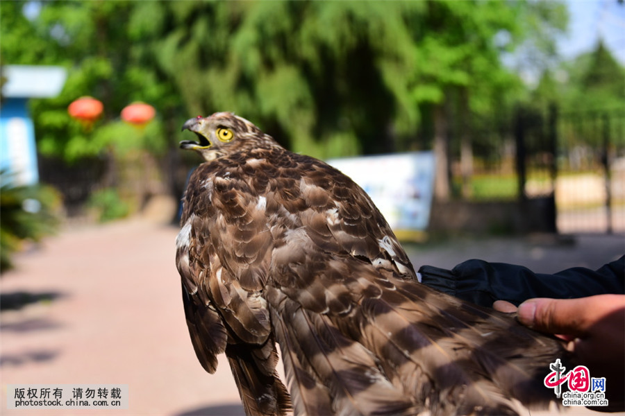 2016年4月19日。郑州,市民田先生救下了一只受伤的大鸟,后送到郑州是林业局野生动物救护站,经该救护站董朝伟站长鉴定,该大鸟为凤头苍鹰,属于中型猛禽,世界濒危物种,国家二级重点保护动物。董站长称,该凤头苍鹰只是鼻子上受伤,经过治疗,5天伤口就能愈合,到时放飞。中国网图片库 李四信/摄