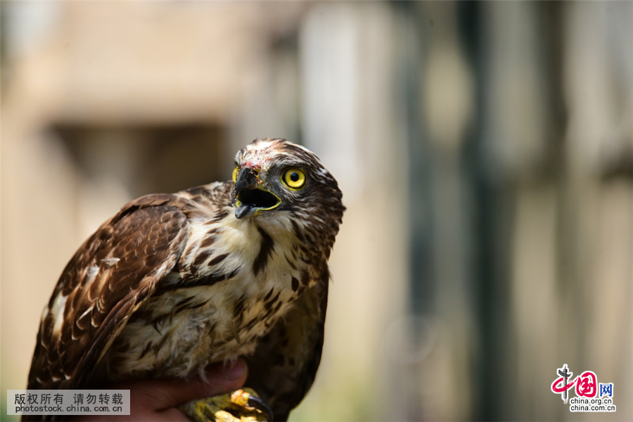 2016年4月19日。郑州,市民田先生救下了一只受伤的大鸟,后送到郑州是林业局野生动物救护站,经该救护站董朝伟站长鉴定,该大鸟为凤头苍鹰,属于中型猛禽,世界濒危物种,国家二级重点保护动物。董站长称,该凤头苍鹰只是鼻子上受伤,经过治疗,5天伤口就能愈合,到时放飞。中国网图片库 李四信/摄