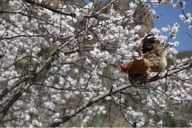 清明之后,北京延庆张山营镇玉渡山南坡已是一片绿意,正值山花烂漫的时节,千树万树杏花已经争相绽放,满眼粉色的花朵和山坡上到处撒欢儿的柴鸡,不时有柴鸡飞上杏树枝头,啄食花朵品尝花蜜,一派田园风光……北京各大商场“农夫市集”里小有名气的“老周农庄”就坐落在这里。