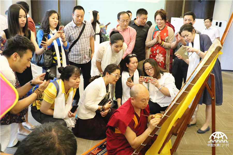 国家级非物质文化遗产项目热贡艺术代表性传承人、中国藏学研究中心唐卡研究院副院长、“神画师”家族第十四代传承人罗藏旦巴现场临摹绘制唐卡。