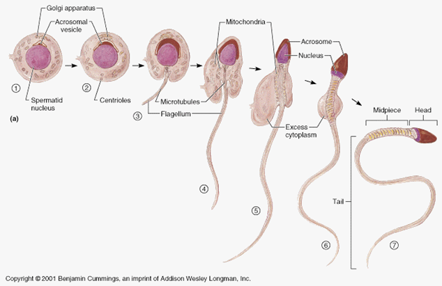 图3 从初级精母细胞到精子的发生过程。来源:2001 Benjamin Cummings