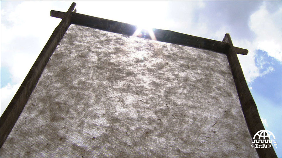 然后,在阳光和高温的作用下,纸浆变得干燥、紧实,只需几个小时,它们就凝结成了一张完整的傣纸。