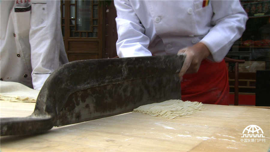 3.8米的一根面让人开了眼,面馆还有一个让人眼前一亮的利器,就是这种三尺多的大铡刀。一把大铡刀大约相当于四把家用菜刀的长度,用起来可有一定的风险。别看厨师的动作轻巧,但这刀间的功力可不一般。光这大铡刀的重量就不秀气。