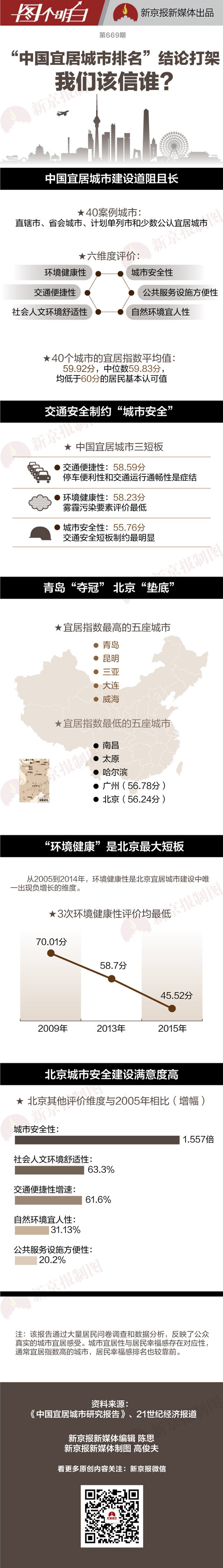近日,中科院发布《中国宜居城市研究报告》。《报告》称,在被调查的40个城市中,青岛宜居指数名列第一,北京则以56.24分垫底。因与去年8月经济学人智库的调查结果——北京蝉联中国大陆最宜居城市——大相径庭,这一结论引发不少争议。