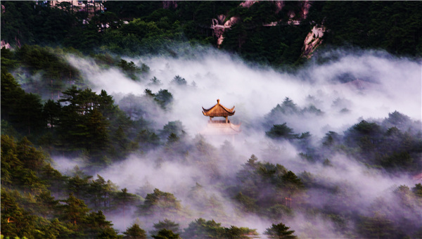 2016年7月9日上午,在黄山拍摄的“瀑布流云”景区。当日上午,立于黄山之巅,只见黄山大大小小山峰时隐时现在云涛海浪之中。云雾在气流的作用下,翻过万道山梁,顺山势如瀑布般倾泄而下,注入深谷,在朝霞的渲染下,瑰丽无比。(方立华)