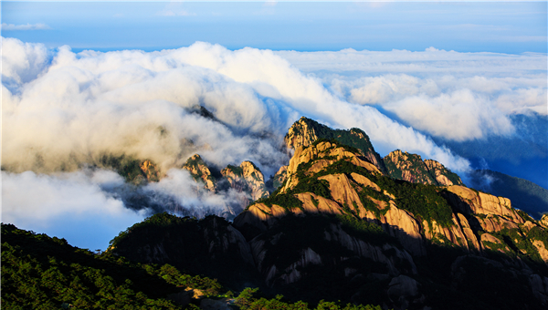 黄山被誉为“天下第一奇山”,千奇百怪的花岗岩奇石,出神入化的涛涛云海,经历狂风暴雨历练的黄山松,绚丽多彩的日出日落,勾勒出黄山的神奇之美。有“淡云横抹晓朦胧,浅碧橙黄紫又红;一霎松岩齐变色,金光如雨沐群峰。”的赞句。