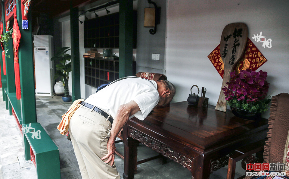 第一次进到四合院,老人惊喜地看到自己在日本门店放着的饭勺模型,立马向它鞠了一躬,上面写着“银饭屋~下饭亭”。