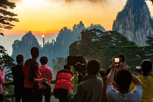 红色是霞。日出日落是黄山最为壮观的美景之一,早晚那迷人的光线和富于变化的色调无疑让许多来山游客和众多摄影爱好者痴迷。一轮红日一升一落,一日的光景在跨越千年的黄山面前化为须臾。虽占据了一早一晚不同的时间段,但同样把黄山染成火红。那一抹火红好似害羞少女面庞上的红晕,温婉中透着几分俏皮,游人至此如入画中。(叶永清)