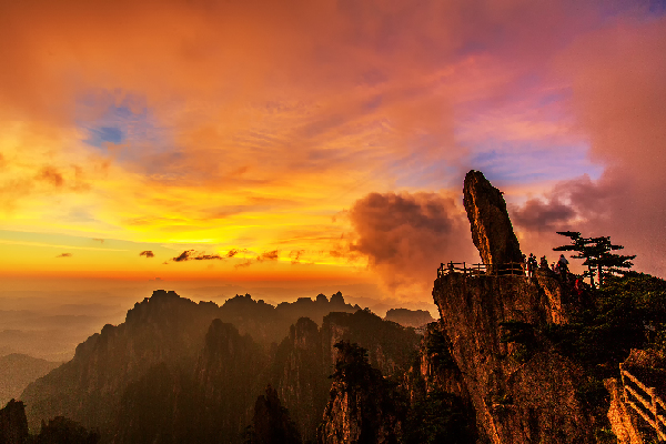 立体画境:夕阳下的黄山飞来石绚丽夺目