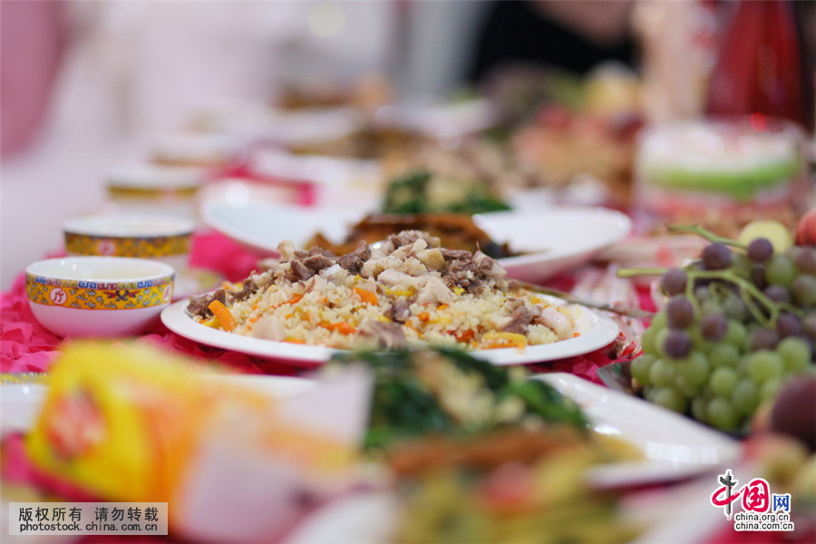 2016年8月14日,婚礼的美食很多,主要是维吾尔族抓饭、汤饭等特色的美食和麻花、巧克力、葡萄干、巴旦木、无花果等新疆独特的小吃点心。中国网图片库 袁欢欢/摄