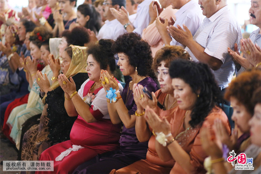 2016年8月14日,新娘父母的宴席结束前,双方的重要亲属做起都瓦(祈祷),真心祝福这对新人。中国网图片库 袁欢欢/摄