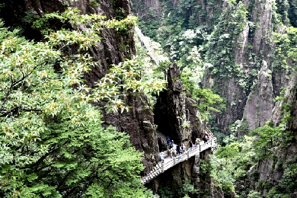 因为六集电视纪录片《大黄山》的播出,黄山西海大峡谷被越来越多人们所了解和熟悉,镜头中的大峡谷人工栈道也给观众留下了深刻记忆。今年暑期,到黄山旅游的游人,纷纷选择到西海大峡谷游览,有不少人就是想实地体验大黄山》镜头里的悬崖边上的人工栈道。人工栈道是围绕着西海大峡谷一座座的山体修建的,一面悬崖峭壁,另一面万丈深渊。在建设过程,施工人员从悬崖上系好安全绳爬下来,凿穿岩壁打孔,钉好支柱架,再用混凝土浇筑与岩石溶合封装,待牢固后再在上面铺木板、护栏,最后再浇栈道的路面水泥石板。行在人工栈道上,游人们如步入画境中。