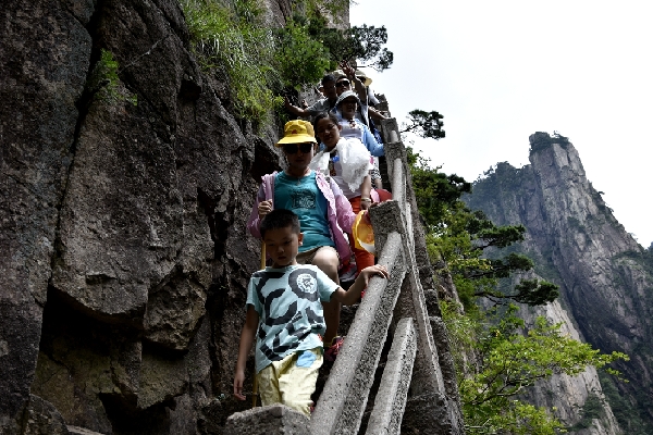 因为六集电视纪录片《大黄山》的播出,黄山西海大峡谷被越来越多人们所了解和熟悉,镜头中的大峡谷人工栈道也给观众留下了深刻记忆。今年暑期,到黄山旅游的游人,纷纷选择到西海大峡谷游览,有不少人就是想实地体验大黄山》镜头里的悬崖边上的人工栈道。人工栈道是围绕着西海大峡谷一座座的山体修建的,一面悬崖峭壁,另一面万丈深渊。在建设过程,施工人员从悬崖上系好安全绳爬下来,凿穿岩壁打孔,钉好支柱架,再用混凝土浇筑与岩石溶合封装,待牢固后再在上面铺木板、护栏,最后再浇栈道的路面水泥石板。行在人工栈道上,游人们如步入画境中。