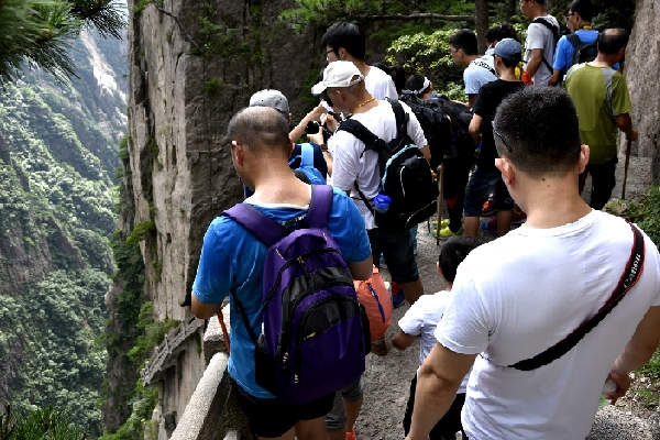 因为六集电视纪录片《大黄山》的播出,黄山西海大峡谷被越来越多人们所了解和熟悉,镜头中的大峡谷人工栈道也给观众留下了深刻记忆。今年暑期,到黄山旅游的游人,纷纷选择到西海大峡谷游览,有不少人就是想实地体验大黄山》镜头里的悬崖边上的人工栈道。人工栈道是围绕着西海大峡谷一座座的山体修建的,一面悬崖峭壁,另一面万丈深渊。在建设过程,施工人员从悬崖上系好安全绳爬下来,凿穿岩壁打孔,钉好支柱架,再用混凝土浇筑与岩石溶合封装,待牢固后再在上面铺木板、护栏,最后再浇栈道的路面水泥石板。行在人工栈道上,游人们如步入画境中。
