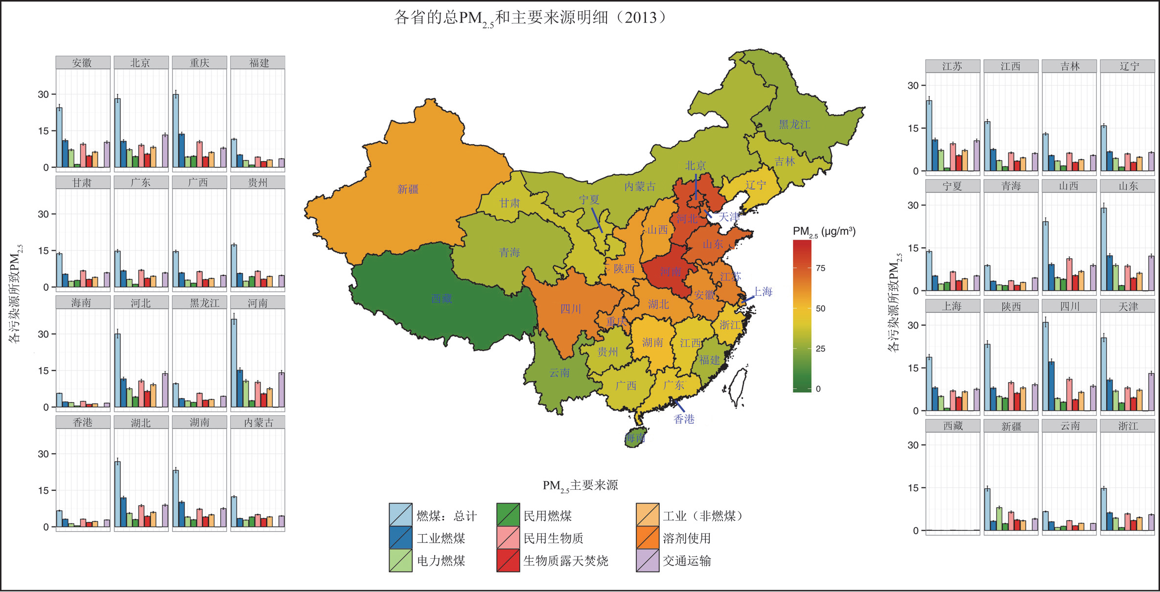 图2. 人口 加权平均的PM2.5 浓度和每个省内各行业导致的PM2.5 浓度