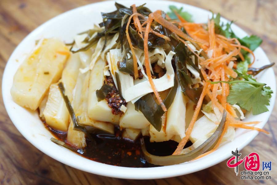 除了这些由宝珠梨当主角的菜肴,当地还有许多可口的特色小吃。第一名当属豌豆粉了,它不仅是“梨园八碗”中的其中一碗,也是平常居民家中的爽口小吃。将豌豆粒磨瓣去皮,用水泡发后掺水磨成浆,过滤、再熬煮成糊状,最后冷却、凝固即可。爽滑细嫩的豌豆粉,配上腌制好了的海带丝、豆皮、胡萝卜丝,浇上一勺秘制汤汁,如果能吃辣,就添上一点辣椒酱。此等开胃凉菜,真是味蕾上的躁动!