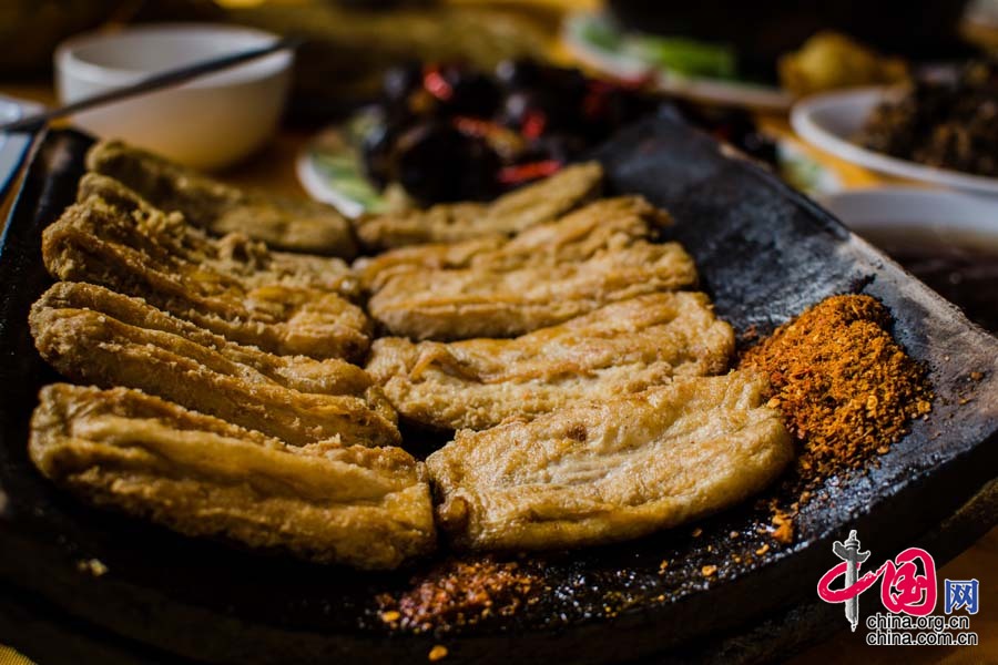 臭豆腐,听过长沙臭豆腐、绍兴臭豆腐,原来咱们呈贡也有臭豆腐。板瓦臭豆腐就是本地臭豆腐放在板瓦上烧着吃。所用的瓦片是专门用来做容器的,不是房上揭块瓦下来就行。臭豆腐熟了以后旁边放上干辣椒面就可以蘸着吃。板瓦呈贡臭豆腐质地软滑,散发异香,真乃“味之有余美,玉食勿与传”。