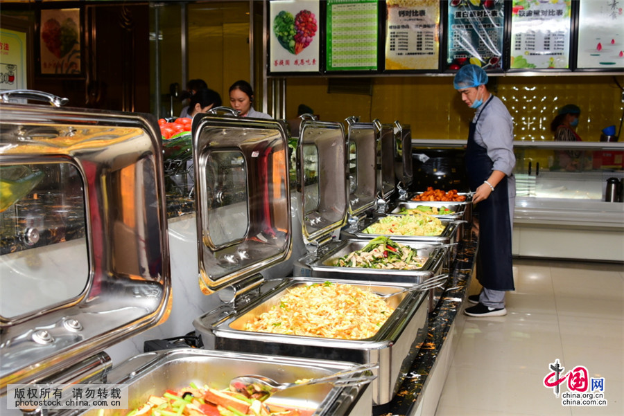 2016年10月8日,郑州健康路郑州七中对面的菩提园免费素食自助餐厅。该餐厅能同时容纳200人就餐,于10月1日正式开业,面向全社会,不论身份就可到此享用免费午餐。该午餐每天提供30多个菜品和水果,而菜品均为素食,要求就餐者自觉排队,按需取食。每张餐桌上放有一个热水壶,就餐者吃完饭后如果碗盘上沾有饭粒,将用其冲冲涮,然后喝干净,做到勤俭节约,不能浪费一粒粮食。中国网图片库 李四信/摄