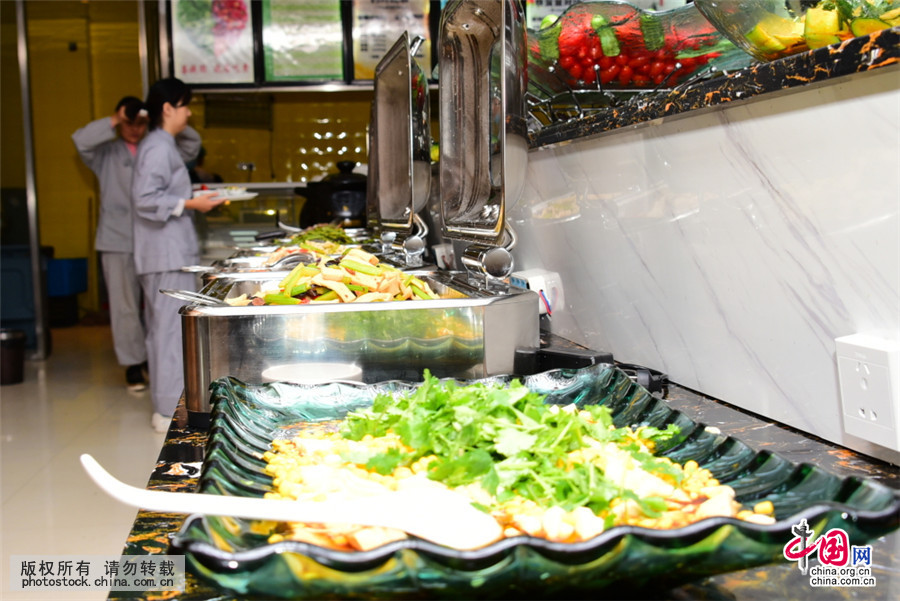 2016年10月8日,郑州健康路郑州七中对面的菩提园免费素食自助餐厅。该餐厅能同时容纳200人就餐,于10月1日正式开业,面向全社会,不论身份就可到此享用免费午餐。该午餐每天提供30多个菜品和水果,而菜品均为素食,要求就餐者自觉排队,按需取食。每张餐桌上放有一个热水壶,就餐者吃完饭后如果碗盘上沾有饭粒,将用其冲冲涮,然后喝干净,做到勤俭节约,不能浪费一粒粮食。中国网图片库 李四信/摄