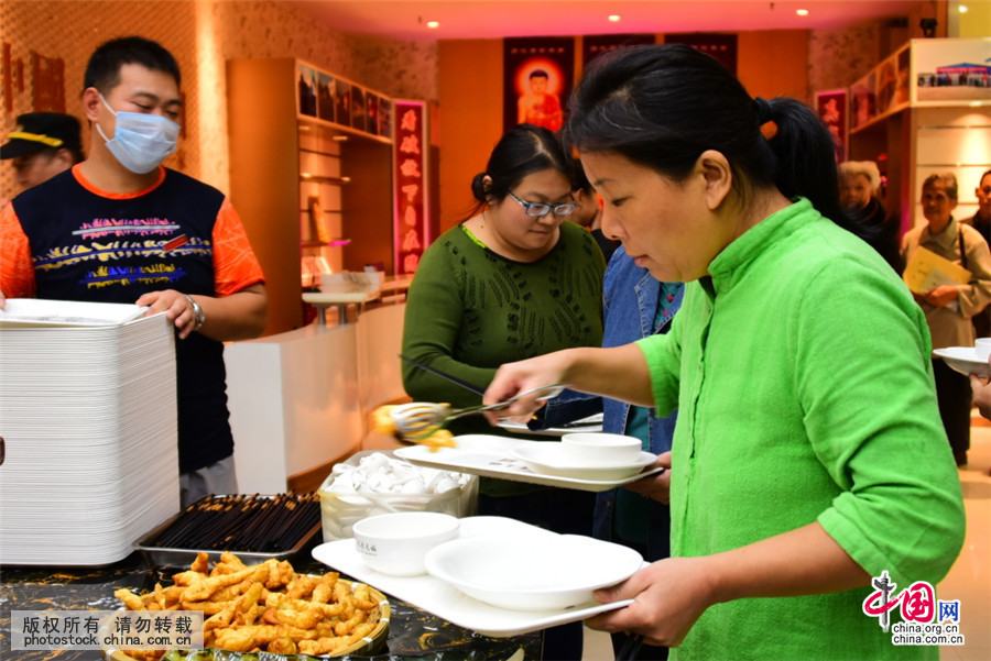 2016年10月8日,郑州健康路郑州七中对面的菩提园免费素食自助餐厅。该餐厅能同时容纳200人就餐,于10月1日正式开业,面向全社会,不论身份就可到此享用免费午餐。该午餐每天提供30多个菜品和水果,而菜品均为素食,要求就餐者自觉排队,按需取食。每张餐桌上放有一个热水壶,就餐者吃完饭后如果碗盘上沾有饭粒,将用其冲冲涮,然后喝干净,做到勤俭节约,不能浪费一粒粮食。中国网图片库 李四信/摄