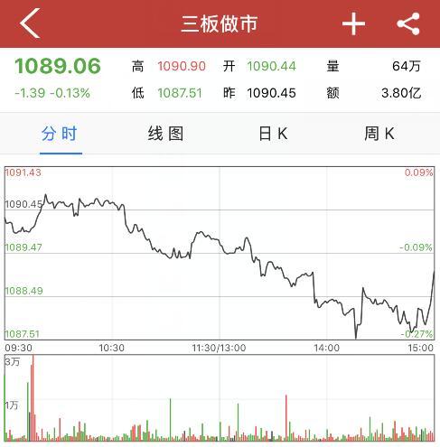 截至收盘,三板做市指数报1089.06点,跌1.39点,跌幅0.13%,成交额3.80亿元。