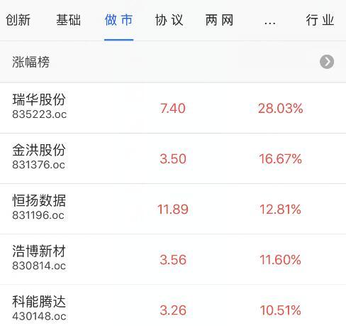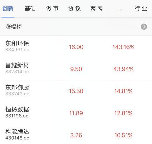 创新层方面,东和环保涨143.16%,领涨创新层个股,昌耀新材、东邦御厨、恒扬数据、科能腾达涨幅居前;南京证券、银都传媒、赛特斯、华图教育跌幅居前。