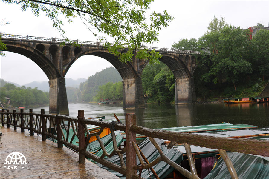 细雨中的边城像一幅墨色山水画,淡淡的远山,皑皑的云烟,静谧的河水,拾级而上的台阶,江边的吊角楼,凤飞的屋檐……恍如人间仙境。中国网/中国发展门户网 王振红摄