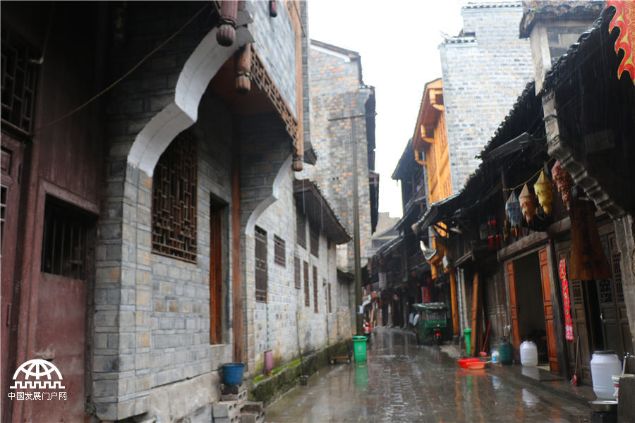 细雨中的边城像一幅墨色山水画,淡淡的远山,皑皑的云烟,静谧的河水,拾级而上的台阶,江边的吊角楼,凤飞的屋檐……恍如人间仙境。中国网/中国发展门户网 王振红摄