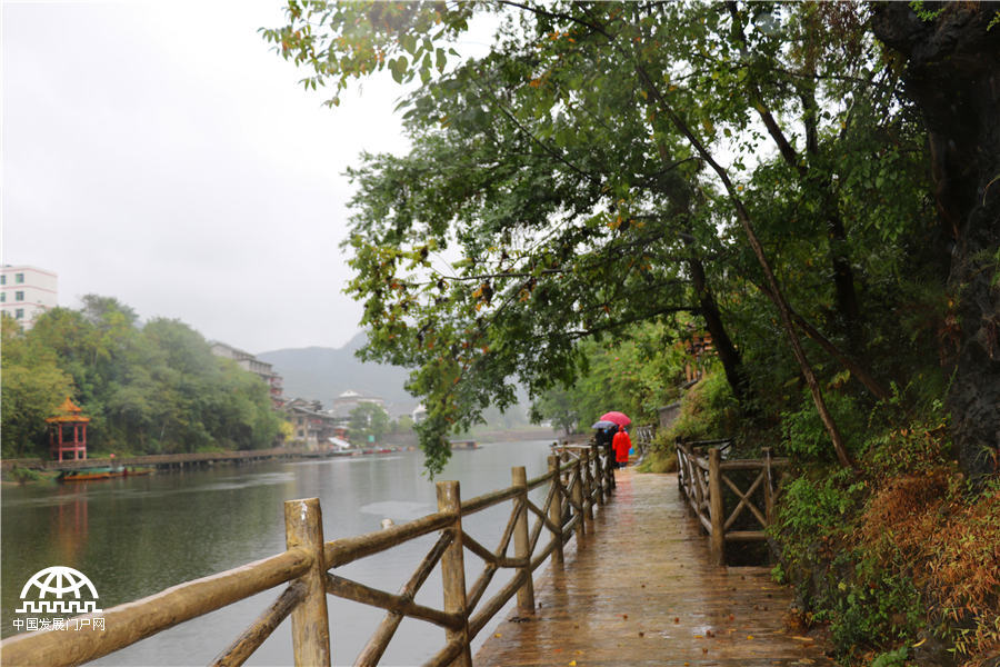 细雨中的边城像一幅墨色山水画,淡淡的远山,皑皑的云烟,静谧的河水,拾级而上的台阶,江边的吊角楼,凤飞的屋檐……恍如人间仙境。中国网/中国发展门户网 王振红摄