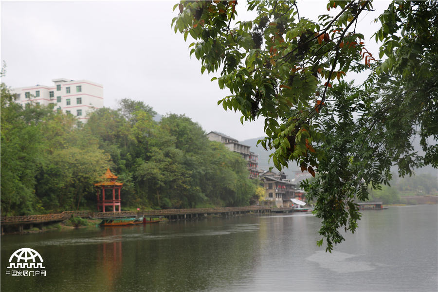 细雨中的边城像一幅墨色山水画,淡淡的远山,皑皑的云烟,静谧的河水,拾级而上的台阶,江边的吊角楼,凤飞的屋檐……恍如人间仙境。中国网/中国发展门户网 王振红摄