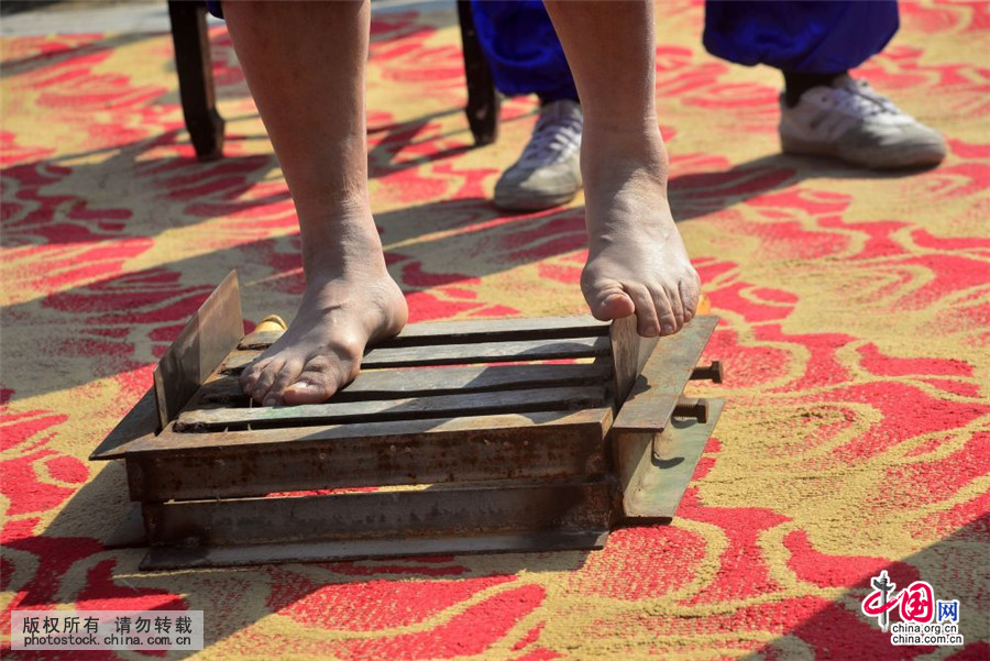 2016年10月30日,来自山东省泰安市肥城市石横镇的民间武术人士徐庆国,在全国(东阿)首届传统武术功力交流大赛上,展示他的功夫,赤脚踩钢刀刃,铁锤贯顶击砖绝活。中国网图片库 史奎华/摄