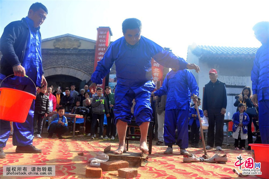 2016年10月30日,来自山东省泰安市肥城市石横镇的民间武术人士徐庆国,在全国(东阿)首届传统武术功力交流大赛上,展示他的功夫,赤脚踩钢刀刃,铁锤贯顶击砖绝活。中国网图片库 史奎华/摄