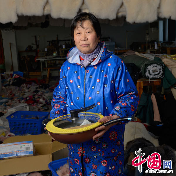 村民沈美仙,64岁,皮草整理工,她花了29.8元从网上购买了一个炒锅,身上的这套工作装——围裙也是从网上购买。