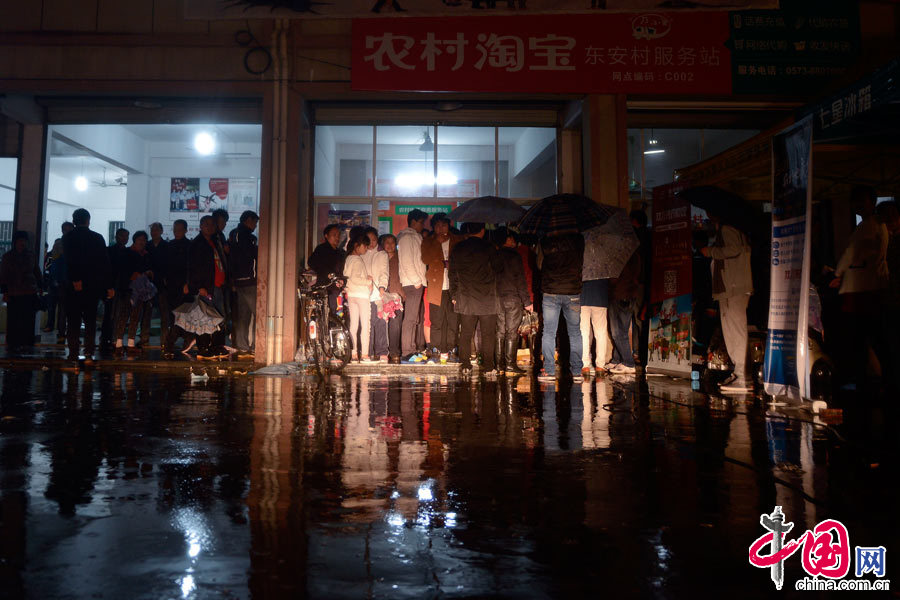 东安村农村淘宝服务站在“双十一”前将厂商直接请到村里,优惠的价格和放心的质量让村民们冒雨参与。