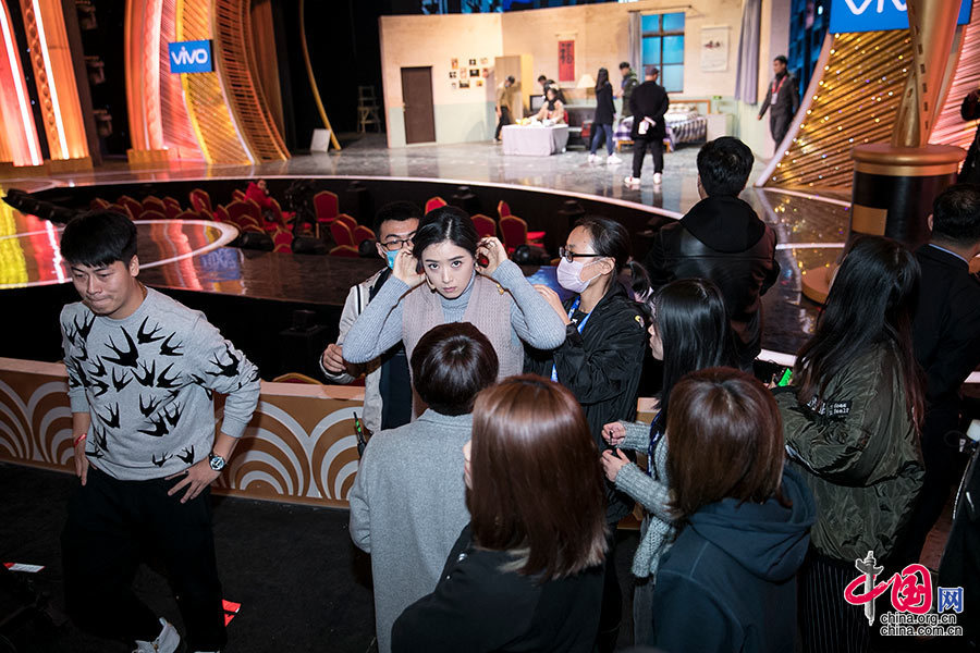 节目录制前唯一一次带妆彩排,蒋欣一行到现场等候。为了更加形象的演绎老太太这一角色,她特意在自己的背上垫了一块垫子,以便让自己的形体看上去显得更老迈些。中国网记者董宁摄影