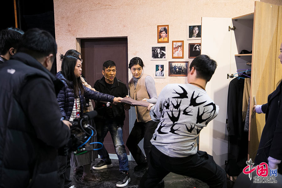 宋小宝和蒋欣对道具要求非常严格,他们表演的背景环境是在一位“空巢”老太太的家中,背景衣柜里面有一件衣服不太平整,来不及熨烫,宋小宝和蒋欣就喊工作人员一起抻直。中国网记者董宁摄影