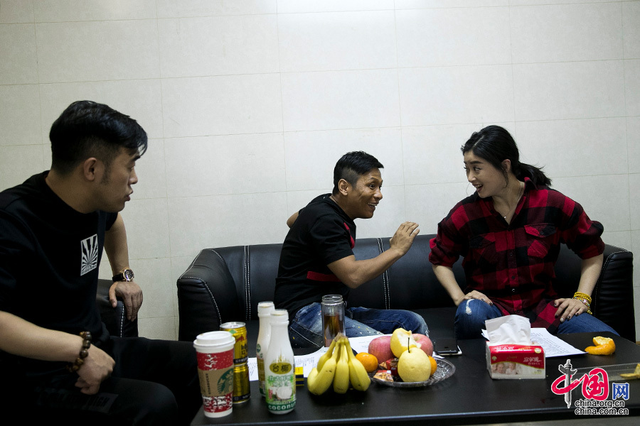 海报拍摄刚完成,宋小宝和蒋欣就抓紧在化妆间继续对词。角色需要,宋小宝请来好友程红(左)担任助演嘉宾。中国网记者 董宁摄影