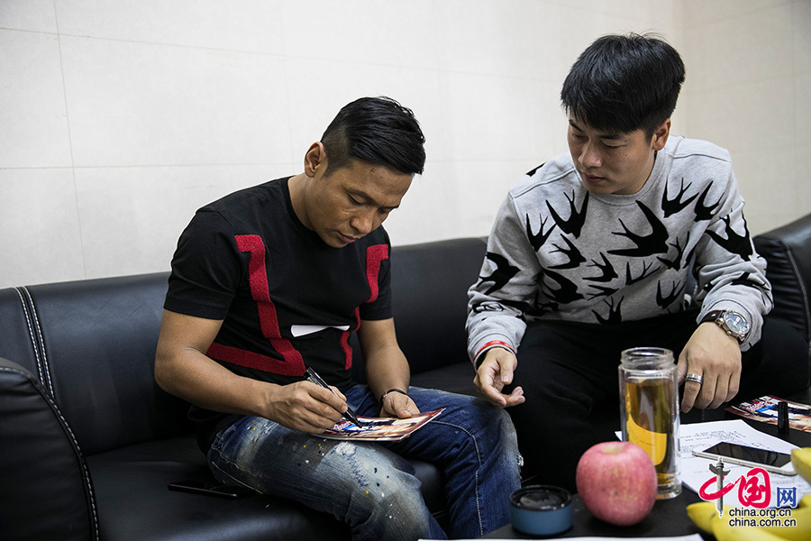 为喜欢自己的粉丝签名是明星最常见的工作之一,排练时间紧张,宋小宝依旧一丝不苟地逐一在照片上签名。中国网记者 董宁摄影