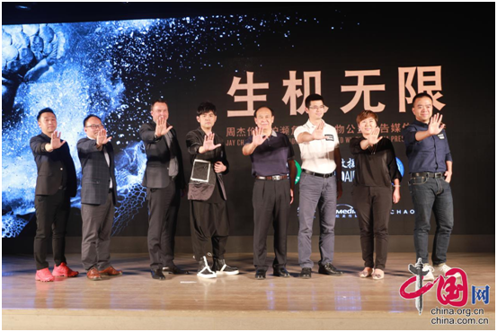 2019年5月27日,保护濒危物种海龟和穿山甲的公益广告《无限生机》在京发布。与会嘉宾做出同一手势,拒绝买卖与杀害野生动物。中国网/张允奕摄