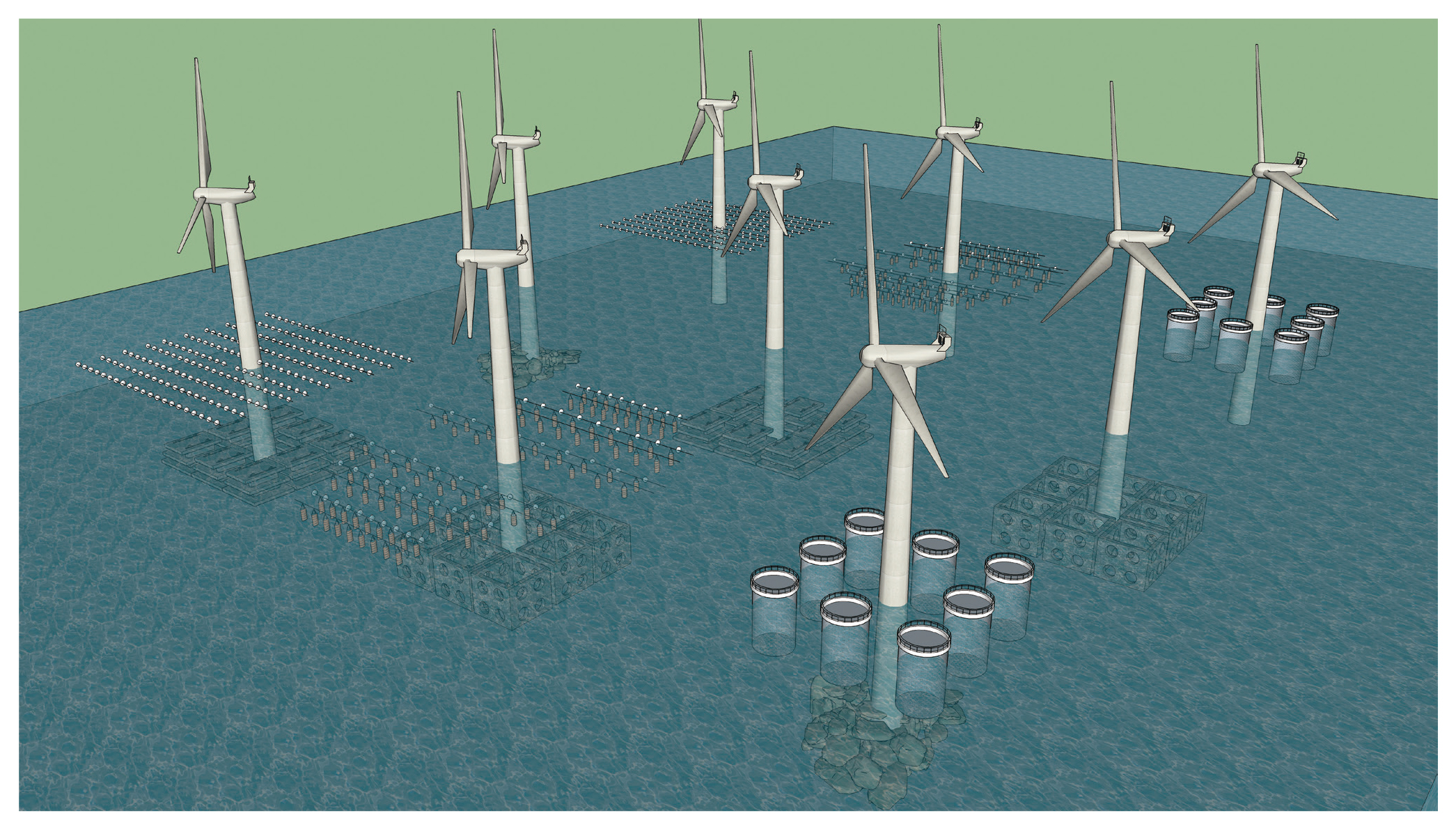 海洋牧场与海上风电融合发展是节约集约用海的重要新型产业模式与未来发展方向(图 1)。目前,以德国、荷兰、比利时、挪威等为代表的欧洲国家已于 2000 年实施了海上风电和海水增养殖结合的试点研究,其原理为将鱼类养殖网箱、贝藻养殖筏架固定在风机基础之上,以达到集约用海的目标,为评估海上风电和多营养层次海水养殖融合发展潜力提供了典型案例。以韩国为代表的亚洲国家于 2016 年也开展了海上风电与海水养殖结合项目,其结果表明双壳贝类和海藻等重要经济生物资源量在海上风电区都出现增加。