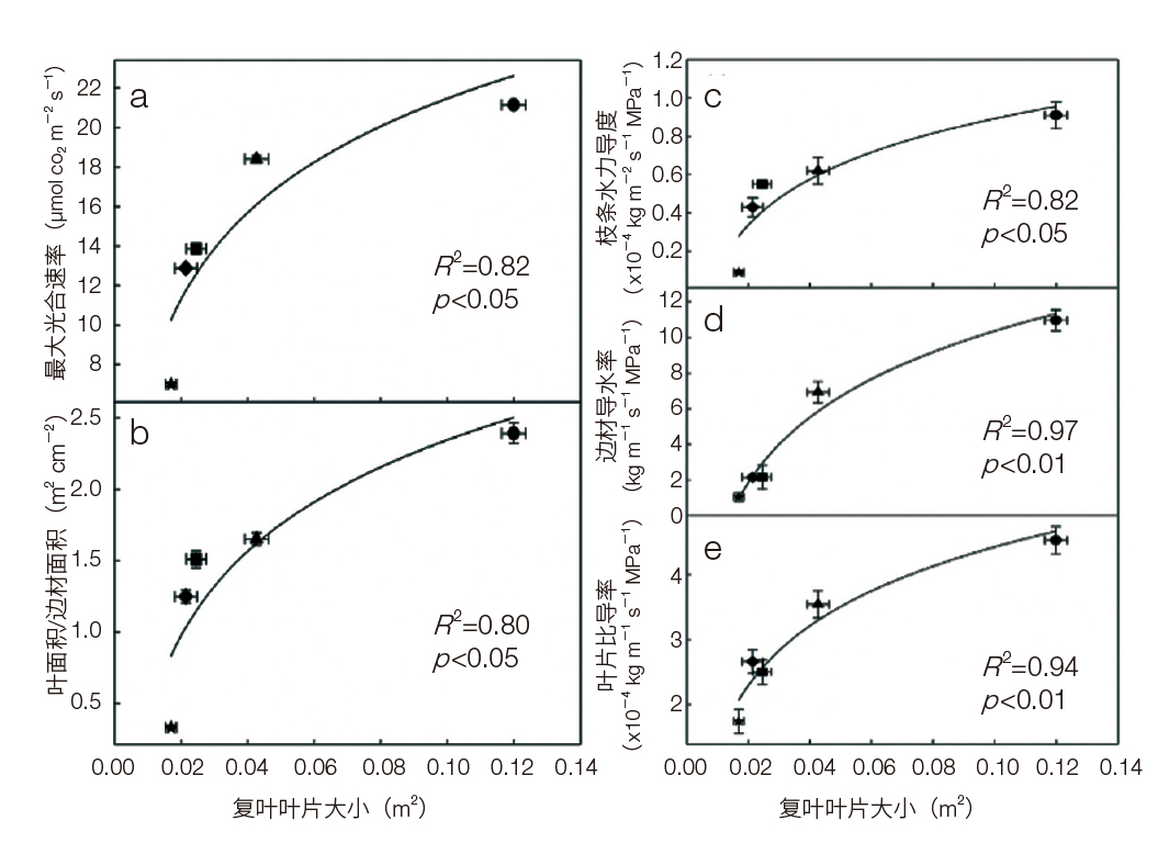 图6长白山阔叶红松林5种复叶树种整枝导水率、最大净光合速率、枝条边材比导率、叶比导率与叶片面积间的正相关关系