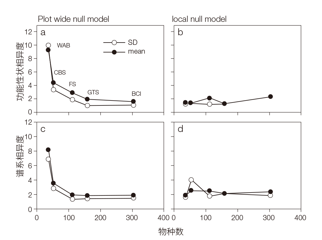 为了验证该假说,在全球范围基于 5 个面积大于 20 ha 森林样地的数据,利用了多变量点格局分析方法,考虑各树种间的亲缘关系和功能相似性,将树种分为促进种、抑制种和中性种,探讨各类型所占比例随物种数的变化趋势。基于随机稀释假说,中性树种所占的比例应随着树种数的增加而增加(图 14)。研究结果与该假说的预测一致,该假说得到了实测数据的支持,并逐渐被国际研究同行认可。