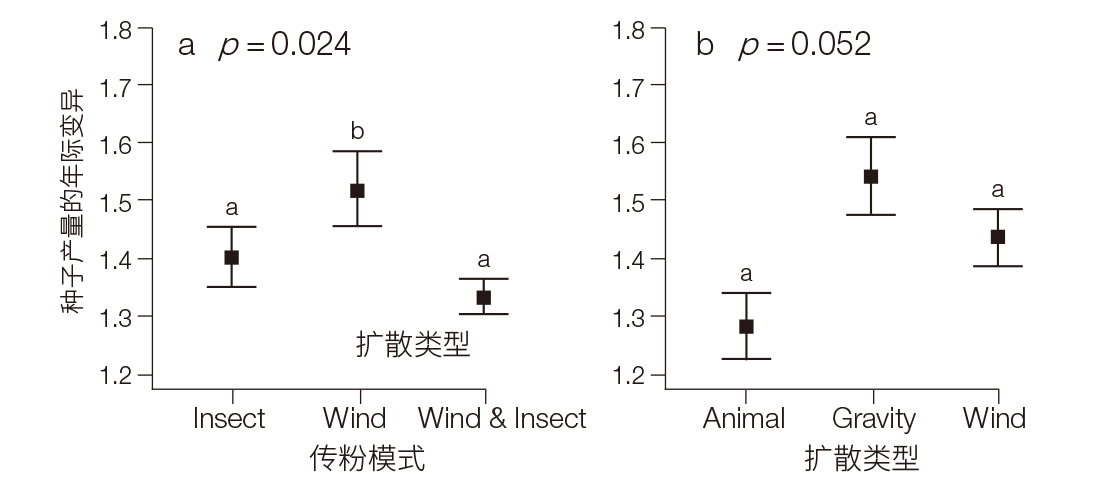 图13不同传粉模式(a)和扩散方式(b)的物种组间的平均年际种子产量变异环境过滤和扩散限制是阔叶红松林 Beta 多样性格局主要驱动力