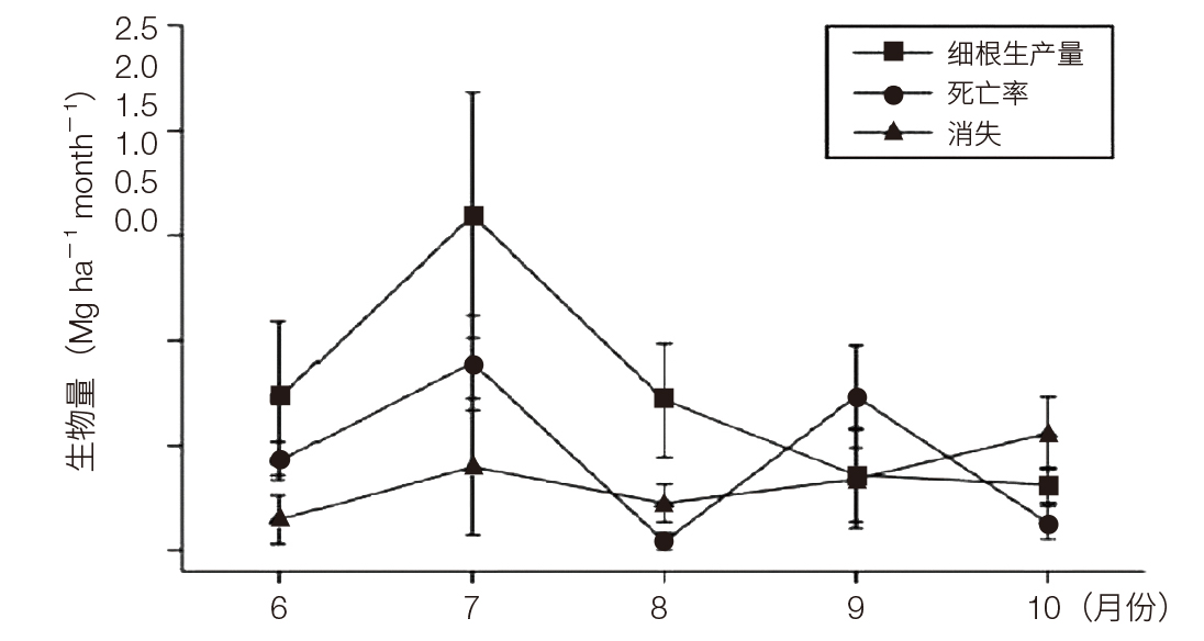 图10细根生产量(MP)、死亡率(MM)和消失(MD)的季节动态